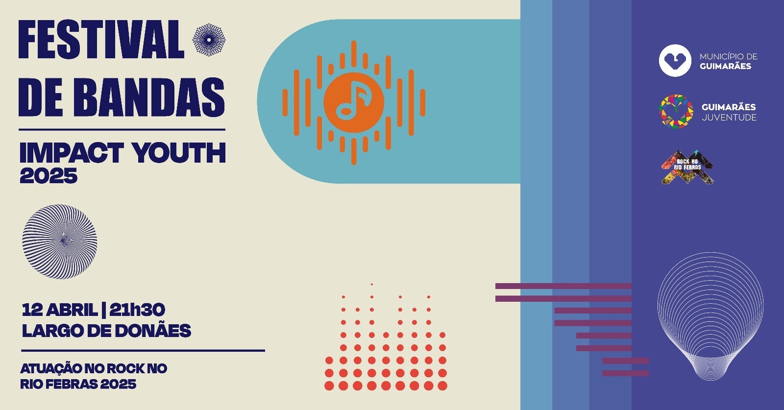 O Festival de Bandas integra o programa do Impact Youth e pretende diversificar a oferta cultural juvenil no Concelho de Guimarães, dar visibilidade à produção musical de bandas amadoras e jovens músicos, com especial destaque para talentos locais e colocar os jovens no centro das atividades, dando-lhe novas oportunidades. Assente na premissa de que Festivais de Bandas permitem que os jovens tenham acesso a diferentes estilos musicais, desde os mais populares até aos alternativos e de que isso amplia o repertório cultural e ajuda a desenvolver o gosto musical, além de incentivar a valorização das expressões artísticas, promovendo a valorização da criatividade e da autonomia, esta atividade permite e pretende que um jovem ao participar, seja como público ou até mesmo como músico, tenha a oportunidade de expressar sua criatividade e autossuficiência. Para aqueles que tocam, o evento pode ser uma forma de mostrar seu talento e conquistar reconhecimento, estimulando o espírito de superação e trabalho em equipa.