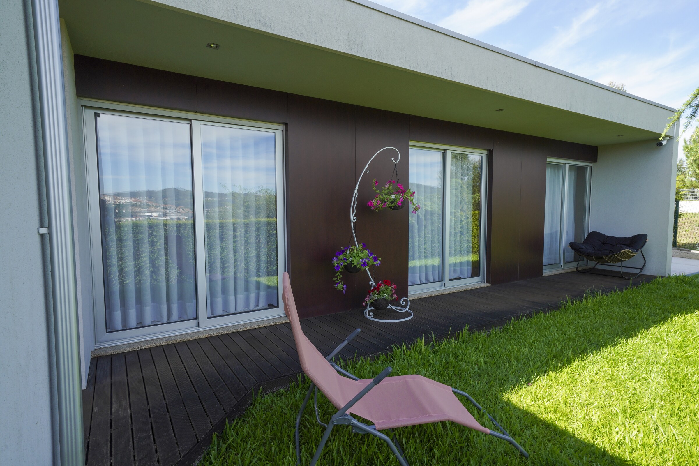 Tanto em frente ao deck como na parte traseira da casa existe um vasto jardim onde poderão relaxar. Nesta propriedade são proibidas festas e fumar dentro de casa é expressamente proibido. Sendo uma casa de um piso, é ideal para pessoas de idade ou com problemas motores.